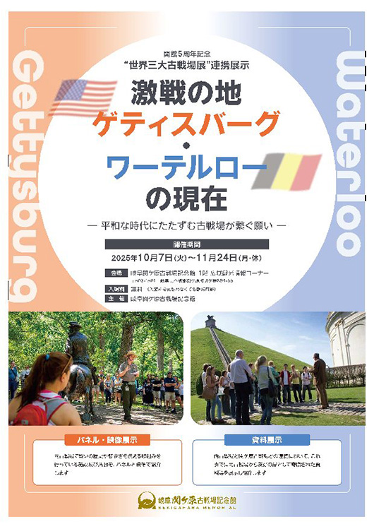 岐阜関ケ原古戦場記念館では、10月7日(火)から開館5周年を記念した秋季企画展「世界三大古戦場展−ワーテルロー・ゲティスバーグと関ケ原のつながり」を開催します。これに合わせ、ゲティスバーグ・ワーテルロー両古戦場の現在の姿をパネルや資料、映像などにより紹介する連携展示を開催します。19世紀に歴史の転換点となる戦いの舞台となった両古戦場は、現在、観光地として多くの観光客が訪れており、戦争の悲惨さを伝えるための取組も行われています。 平和な時代に受け継がれた古戦場の現在の姿や、平和の願いを後世に継承する取組に触れていただけますので、是非、ご覧ください。 (1)パネル・映像展示 両古戦場で戦いの歴史や悲惨さを伝えている施設及び活動を、パネルと映像により紹介します。 【主な紹介施設】 〇ゲティスバーグ古戦場 ・ゲティスバーグ国立軍事公園博物館・ゲティスバーグ国立軍事公園 ・ゲティスバーグ国立墓地・シュライバー・ハウス博物館 〇ワーテルロー古戦場の紹介 ・ウェリントン博物館・メモリアル1815 ・ウーグモン農場・モン・サン・ジャン農場 (2)資料展示 両古戦場と関ケ原古戦場との連携において、これまでに両古戦場から友好の品として寄贈された資料を展示し紹介します。 ---------------------------------------------- ※詳しくは、ホームページでご確認ください。 https://sekigahara.pref.gifu.lg.jp/news/p7890/ ---------------------------------------------- |