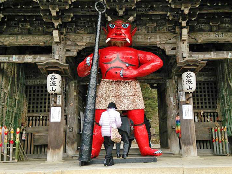 毎年節分が近づくと、仁王門前に高さ4メートルの大きな赤鬼像が姿を現します。この赤鬼の股をくぐると厄払いになるとされ、無病息災を願って赤鬼の下をくぐる参拝客の姿が見られます。